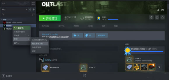 1、首先打开steam,点击逃生(outlast)的游戏图标,鼠标右键--管理,选择“浏览本地文件”;
