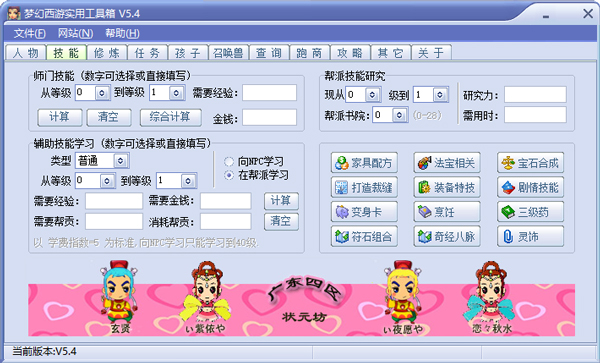2、【技能】提供了师门技能、帮派技能研究、辅助技能学习的数据计算,以及家具配方、法宝相关、宝石合成等资料的查询。