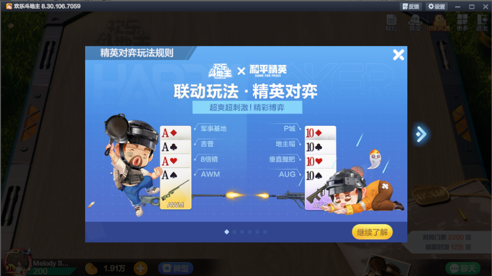 3、精英对弈:精英对弈是欢乐斗地主与和平精英联动,完全创新的一个对战卡牌游戏。玩法是由两名玩家 1V1 进行,双方拥有一样的初始血量,需要通过将手牌与公共牌组配对,形成自己的攻击牌面,来减少对方的血量。最终将对方的血量扣减到0,则获得胜利。