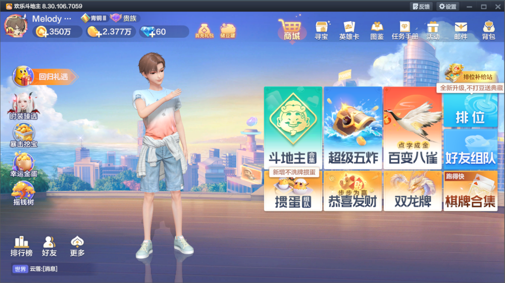 欢乐斗地主电脑版是一款超好玩的棋牌手游,里面有很多有意思的牌局玩法,比如掼蛋、双龙牌、百变八雀等等,每个玩法都有独特的规则和乐趣。我最喜欢的是双龙牌,因为它的胡牌机制很紧张刺激,感觉像在玩麻将一样!游戏里还有排位系统,可以挑战段位赢奖励,挺有成就感的。最让我惊喜的是自定义捏脸功能,你可以把自己变成帅哥美女,或者打造独特的搞怪造型,在游戏中脱颖而出。还有各种时装发型随心换,简直太有意思了!如果你喜欢斗地主,这款电脑版绝对值得试试,玩法多样又有趣,而且画风还超赞!