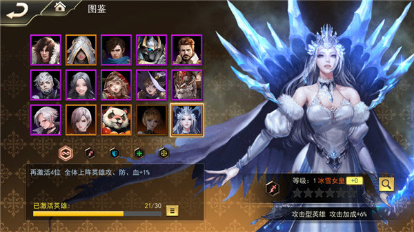 玩家可以通过不断收集新的英雄来激活不同的属性加成,这些属性加成包括增加生命加成,减伤,增伤等等,每位英雄都能提为团队做出贡献。当玩家收集到一定数量的英雄时还能额外解锁图鉴属性哦。在游戏的很多时候,往往这些隐藏属性能起到非常重要的作用,前期的英雄碎片收集自然也是玩家要重点关注的。