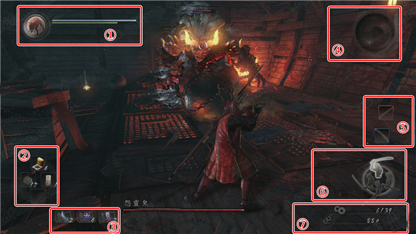 ⑦金钱和精华。其中金钱是用来购买道具,在锻造铺强化武器的,而精华则是用来强化主角自身属性的,消耗一定精华之后就能升级。死亡后金钱不会丢失,但精华则会停留在尸体处。如果在找回尸体的途中再次死亡,则会损失之前的精华。在一次任务之中退出,任务所得精华也会全部丢失。