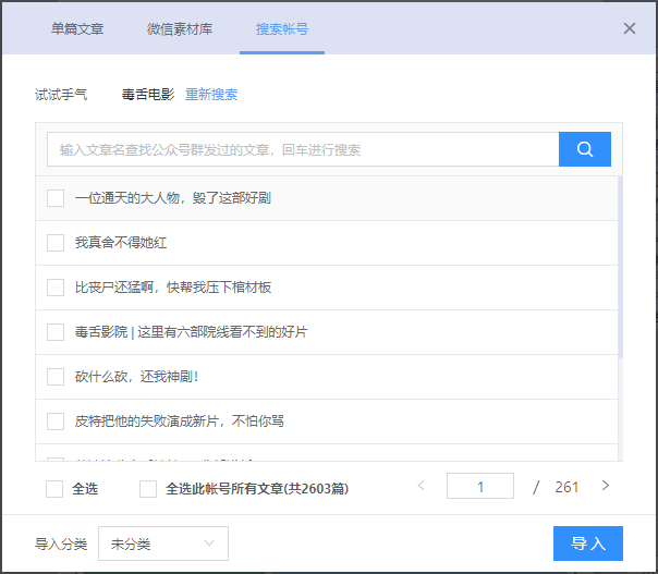 可将本地的单篇或多篇文章发送到微信的素材库,自动生成图文消息。用户可调整文章在图文消息中的先后顺序。