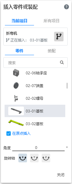 从用户所创建的所有项目以及被分享的项目中选取零件或装配进行插入,界面如下图所示: