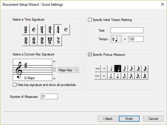 安装向导是 Finale 最简单、最有效的入门方式。向导中的每个页面都允许您快速指定所有基本乐谱元素。