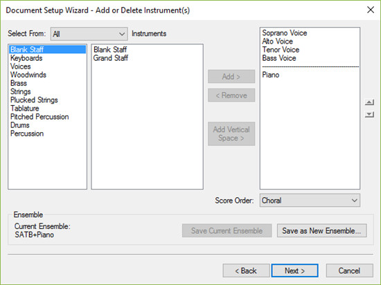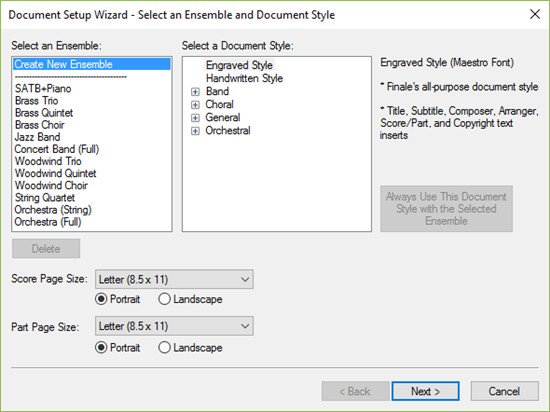 此页面列出了可用于创建新文档的合奏和文档样式。文档样式包括与特定书写样式相关的字体和标记。首先列出了两种最常见的文档样式(“雕刻”和“手写”),其他选项列在各自的子类别中。要更快地设置文档,您可以从预设合奏列表中进行选择。或者,如果您没有看到列出的要使用的仪器,您可以创建自己的整体