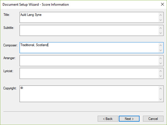 键入标题“Auld Lang Syne”,然后单击“作曲家”文本框并键入“传统,苏格兰”。单击下一步