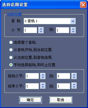 其中中间两个所说的当前位置,是指定位线(音符输入时,垂直的小黄线),对话框弹出时,会自动计算定位线的起始小节,和拍数。
