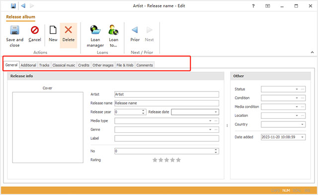 若要添加盒式磁带或乙烯基记录,可以将所有信息输入相应的字段,并从计算机上的文件夹中选择封面图像。