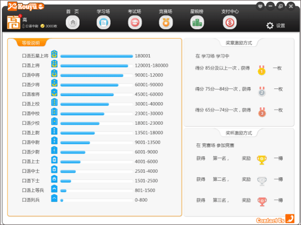 (5)口语等级:口语等级的进阶规则详见点“击用户头像——我的空间——我的荣誉——等级说明”。