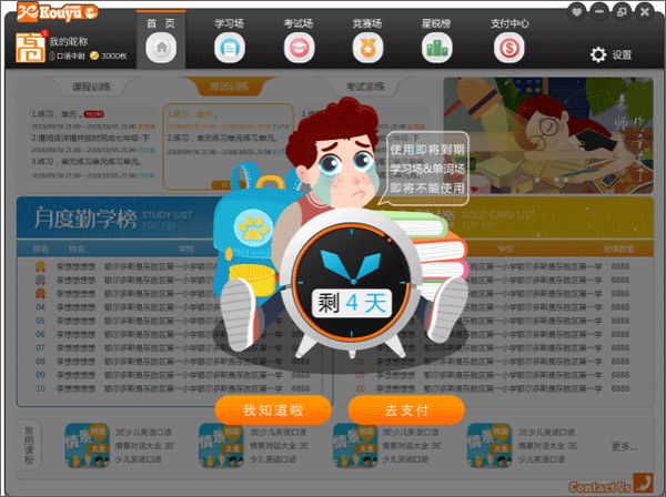 表示您的服务即将到期,到期后各终端“学习场&单词场”将不能继续使用,需要您前往支付中心通过微信或支付宝进行支付后,继续使用全部功能。另外,微信关注3E口语家长通公众号,绑定孩子3E账号后,也可在“个人中心——我的支付”中进行支付。