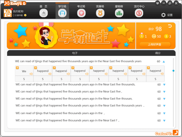 新一代的英语智能语音听说训练学习平台,提供单词练习、单句练习、角色扮演、短文朗读、短文复诵等五大学习模式。能够精确指出每一个单词、音标存在的发音问题,采用智能评分引擎,在练习的过程中实时、准确的评测学习者的发音。