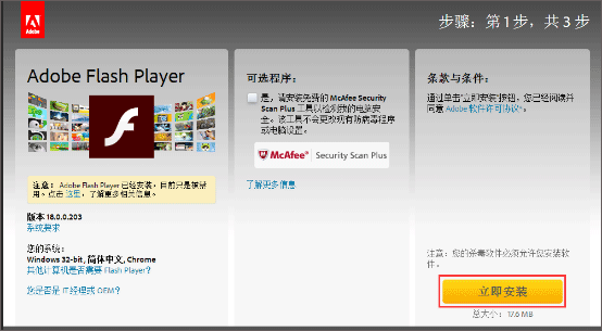 打开浏览器,在地址栏输入https://get.adobe.com/cn/flashplayer/,选择立即安装。
