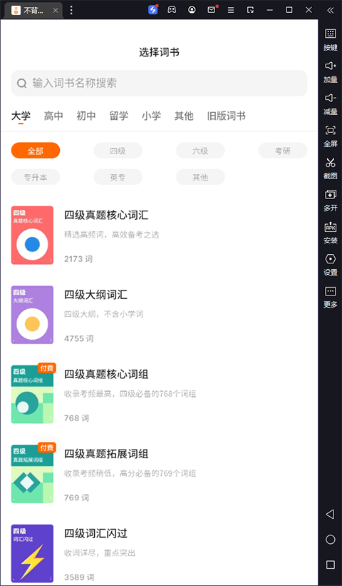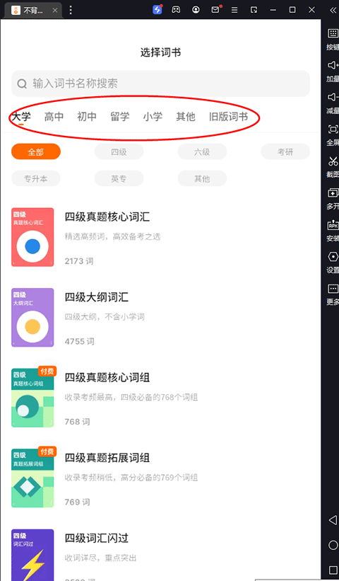 2、接下来选择自己需要的词书,包含大学、出国、实用、高中等分类;