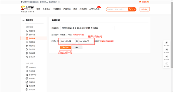 选择时间计划,点击“生成计划”(计划时间最少大于一周),系统即生成成功。 学员根据该刷题计划,做完对应题量即可;