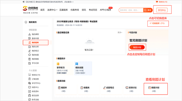 请您打开欣师网校官网 www.xs507.com,登录后,点击学习中心--我的题库--选择购买的题库(右上角可切换题库),点击定制计划,生成计划