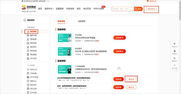 请您打开欣师网校官网 www.xs507.com,登录后,点击学习中心--我的课程--点击购买的套餐,点击去听课,进行看课。