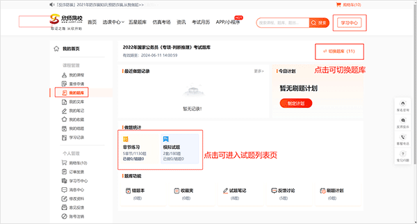 请您打开欣师网校官网 www.xs507.com,登录后,点击学习中心--我的题库--选择购买的题库(右上角可切换题库)