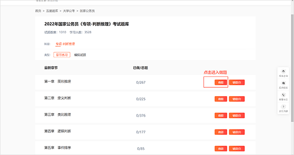点击做题按钮,进行做题。如章节标题显示【待更新】或者总题量为0,表明还未更新,暂时不可以做题,请您耐心等待试题的更新。