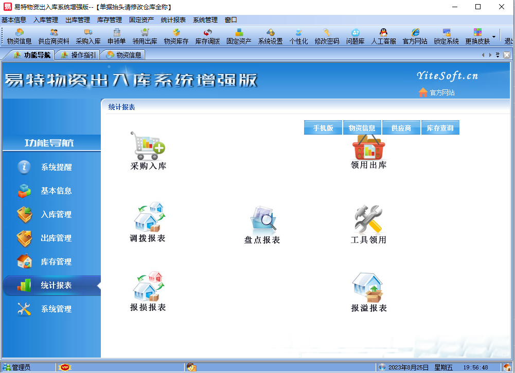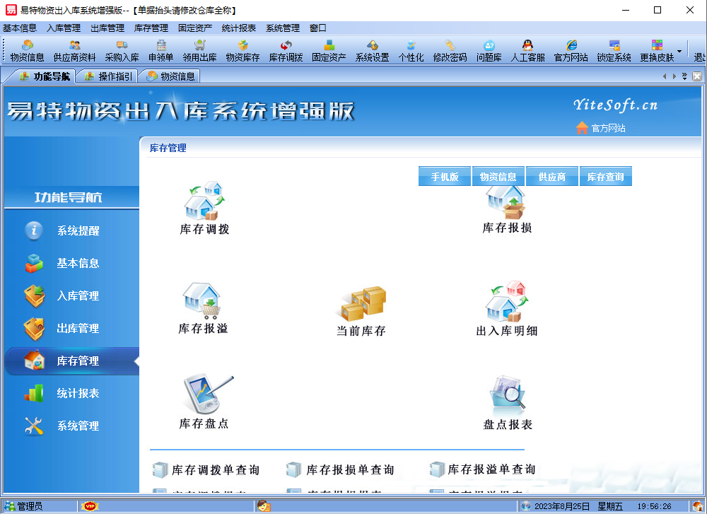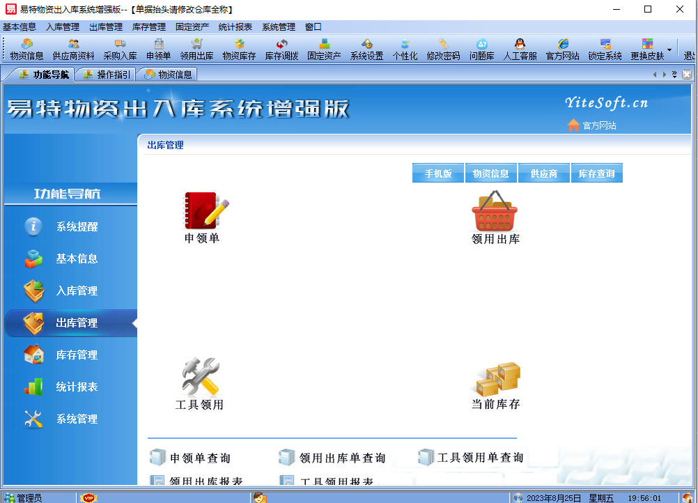 易特物资出入库系统增强版是一款专业的针对企业内部单位库存管理软件,针对内部申领,领用出库,工具领用移交等,其中包含库存管理系统(仓库管理系统),报表系统等子模块。软件界面设计简洁,美观,其人性化的软件流程,使普通用户不需培训也能很快掌握软件操作使用方法,上手极易。被广泛应用于企业、商贸公司、个体门店等用于商业销售管理、库存管理、财务管理等、客户管理、员工管理等场合,有需求的朋友不妨下载体验!