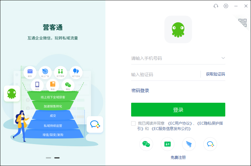 ec营客通官方版是目前腾讯战略投资的移动CRM系统,该系统集客户管理、H5微营销、协同办公、外勤管理、在线客服于一体,能够帮助用户高效连接你的客户,通过高效开发客户、抓住客户资产、进行即时的销售过程管理,帮助企业解决销售管理难题,让销售更容易,适用于金融、教育培训、商务服务、互联网、物流、招商加盟企业、电子、房产等行业。