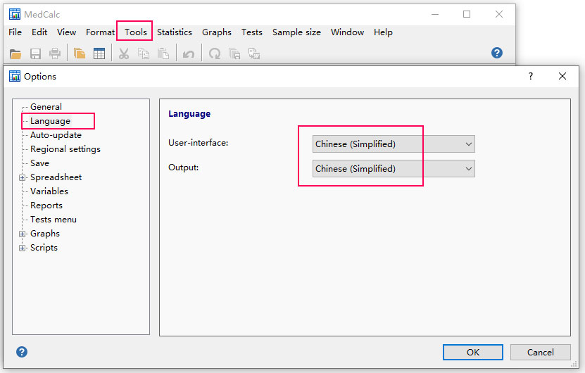5、中文设置:点击tools--options--language--两个语言都选择chinese simplified简体中文;