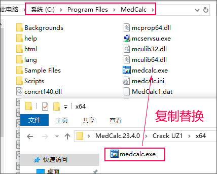 4、将Crack UZ1激活文件medcalc.exe复制替换到软件安装目录下替换