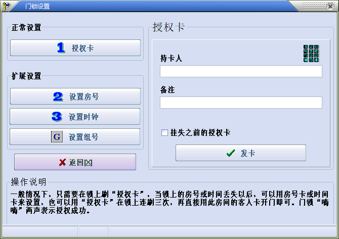 1、采用最先进的无驱USB技术门锁设置轻松愉快,可以不用“房号设置”与“时钟设置”,用授权卡连刷三次,再用对应的客人卡开门,房号与时钟就已经带入了门锁。