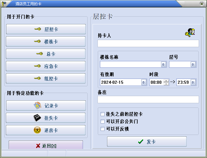 此功能用于除客人外其他所有的卡是否具备后卡覆盖前卡功能。如果勾上此项就表示已经取消可卡覆盖功能。如果不勾上,由制员工卡时是否勾上来决定后卡开门后是否挂失前卡。卡覆盖功能是按卡类型来覆盖的,也就是说只有同类型的卡才能后卡覆盖前卡。
