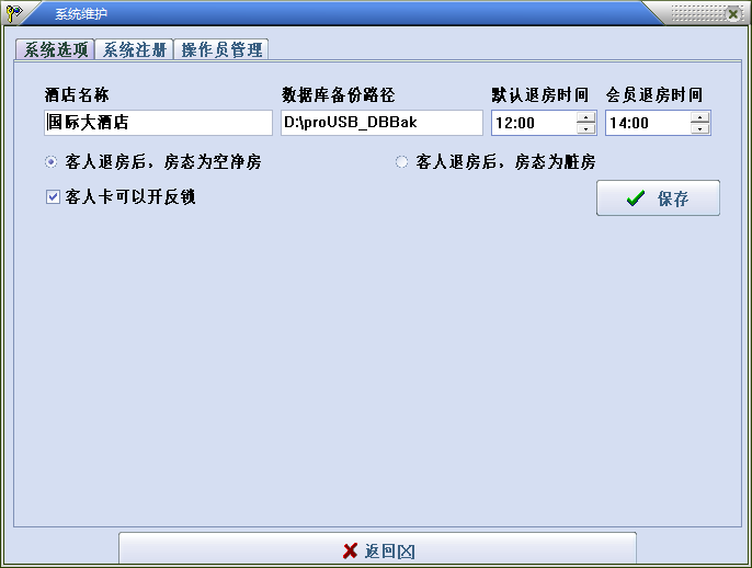 在此画面可以输入酒店名称、客人的默认退房时间、客人退房后的房态,还可以选择客人卡能否开启内部反锁了的门锁。输入完成后点“保存”即可。