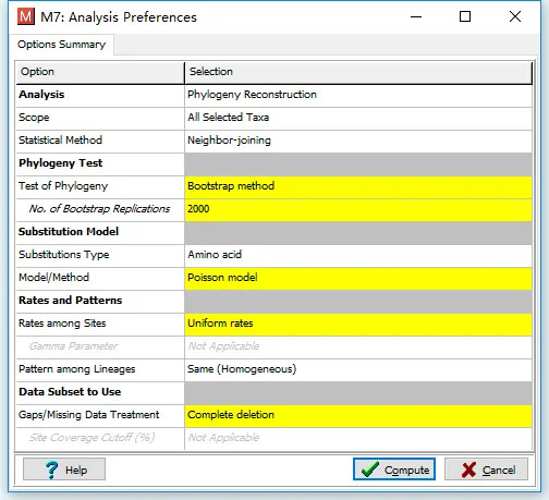 7、在Test of Phylogeny 选择Bootstrapmethod; No.ofBootstrap replications 输入2000; Mode/Method 核酸选择Maximum Composite Likehood, 氨基酸序列选择Poisson model; Rates among sites 选择Uniform rates; Gaps/Missing Data Treatment 选择Compeledeletion, 点击Compute得到下面结果,根据自己的需求对树进行修饰。