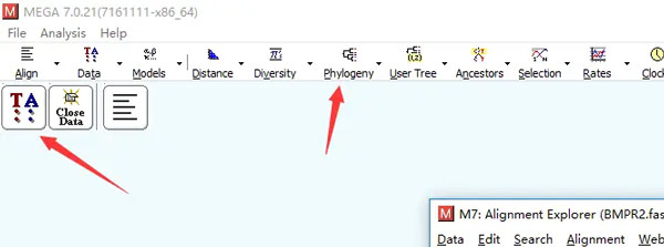 5、比对完成后,点击Data –Phylogenetic Analysis,出现下图坐标箭头指向的两个按钮。