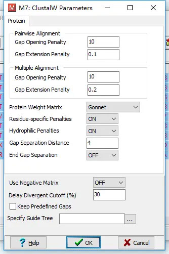 4、点击Alignment –Align by ClustalW ,选择所有序列,出现下图,参数根据需求修改,在这我们就直接选择默认,点击ok。