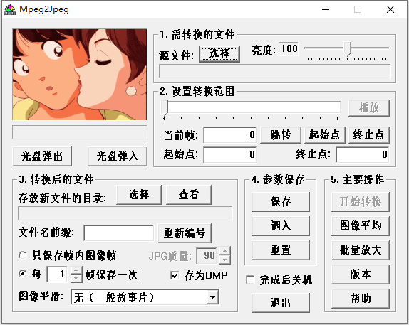 Mpeg2Jpeg官方版是一款功能强大的视频画面截取工具,采用了先进的图像平均技术,能够对从CD中抽取的静态画面进行有效的补偿处理,不仅让用户能够轻松地从视频中提取出高质量的静态画面,还可以保最终输出的图片质量达到最佳状态。