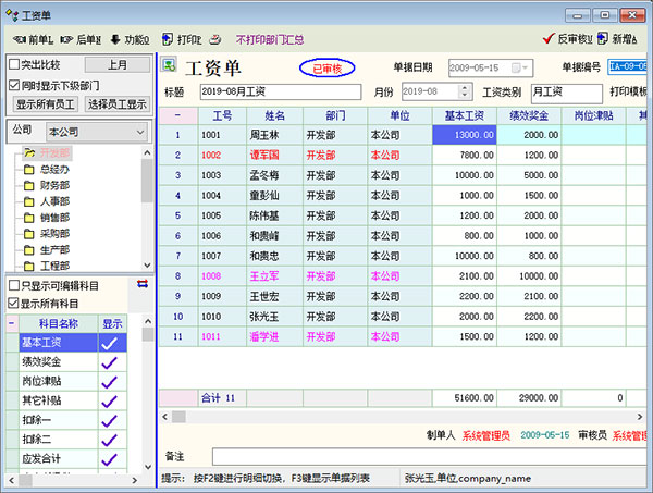 3、方便的工资录入界面,可指定部门显示、指定科目显示,自动计算