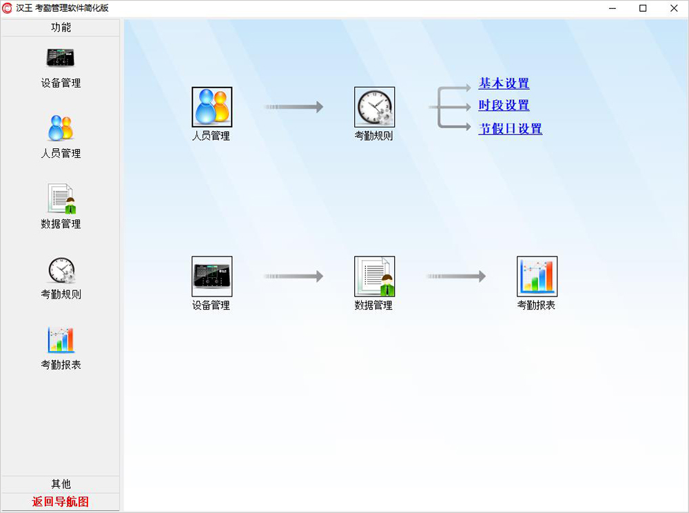 汉王考勤管理软件简化版是汉王考勤管理系统中最精简的一个版本,同样是汉王人脸通考勤机的配套软件,拥有设备管理、人员管理、数据管理、考勤规则、考勤报表、添加卡点等功能,可以满足客户的日常基本使用需要。需要注意的是:第一次使用汉王考勤管理软件简化版前,系统要求完成一些例如服务器设置、员工信息、考勤规则、单位班次及员工排班等基本设置,请用户根据提示操作即可。