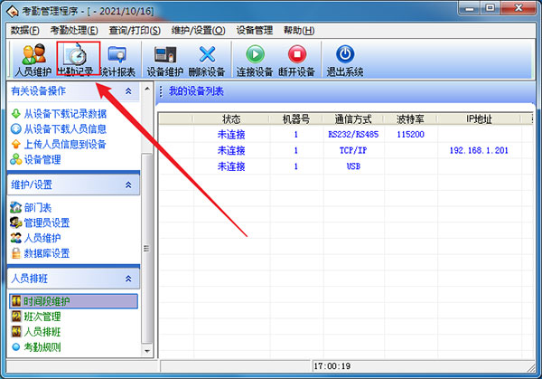 7、将设备上的考勤数据下载至软件中(连接设备-从设备下载记录数据);