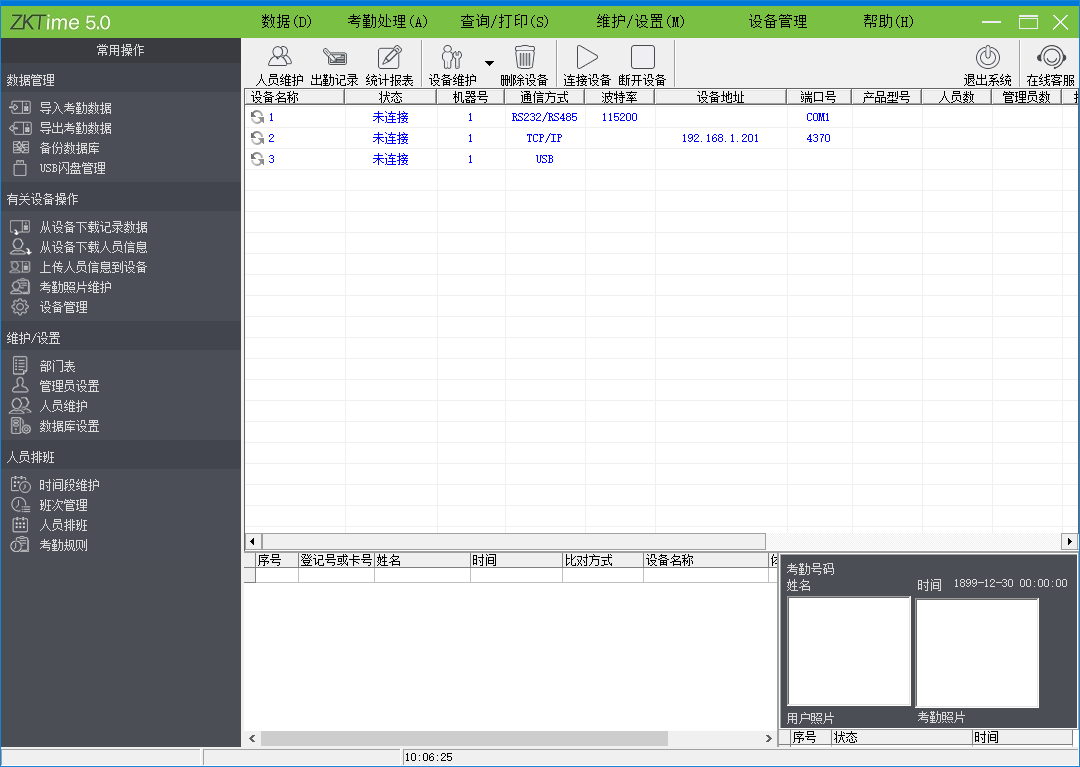 1、将在设备上登记好的用户的指纹或卡下载到软件中(连接设备-从设备下载人员数据);