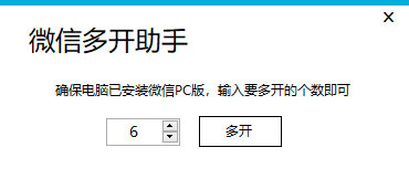 由于许多人有在同一台电脑上登录两三个微信的需求,为了满足广大用户的使用需求,小编带来了电脑微信多开助手,这是一款体积小巧、简单易用的电脑版微信多开器,可以一键多开最多100个电脑版微信,非常适合需要使用多个微信账号的用户。而且具体的操作也非常的简单,只需先确保电脑已安装好微信,随即输入要多开的个数即可,非常简单实用。如果你也想实现在一台电脑上登录多个微信账号,那么此软件绝对适合你,没有任何补丁和病毒,用户可以放心使用,下文还奉上了详细的微信多开操作教程,有需要的用户赶快来下载吧!