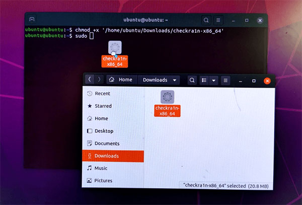 输入「chmod +x 」注意加号前面有个空白键、x 后面也有空白键, 然后将Checkra1n 拖入终端机视窗中按下Enter。接着输入「sudo 」注意sudo 后面有个空白键,然后再把Checkra1n 拖入终端机视窗中按下Enter。
