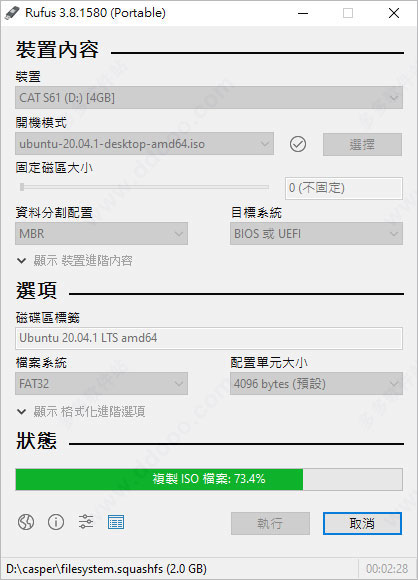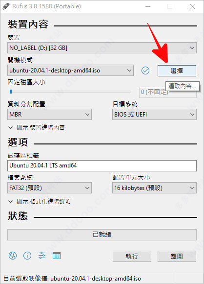 插入USB 并开启Rufus 找到「选择」,找到刚刚下载的「ubuntu-20.04-desktop-amd64.iso」,其余的选项都保持预设即可,点击「执行」开始制作;
