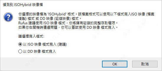 然后会看到一个警告,内容大概就是说明USB 中的所有资料将会被格式化,若有重要资料的话请先进行备份,接着选择「以ISO 映像模式写入(建议)」后按下OK;
