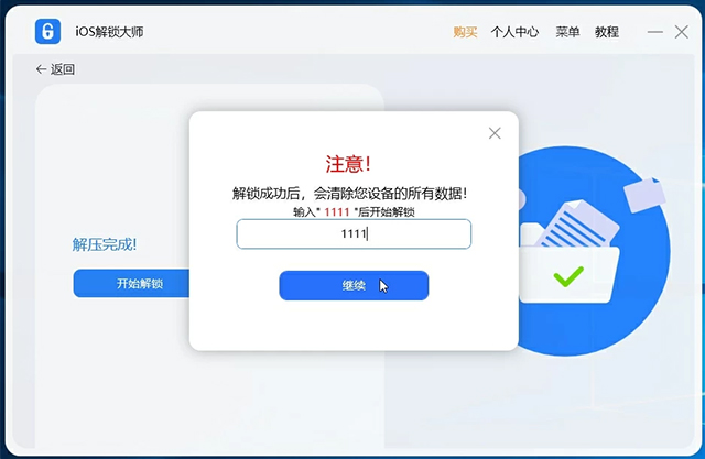 2、在提示中输入『1111』,然后点击『继续』。只需几分钟,屏幕锁就会被解除。