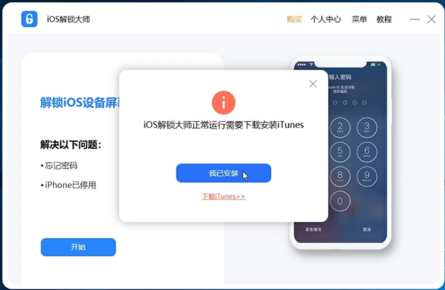 注:iOS解锁大师正常运行需要安装iTunes,如果您已安装iTunes,请点击『我已安装』;如果您没有安装,请点击『下载iTunes>>』并完成下载和安装iTunes到您的电脑。