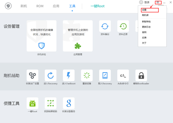当然可以啦,打开刷机精灵软件,点击右上角的更多按钮,选择【设置】。