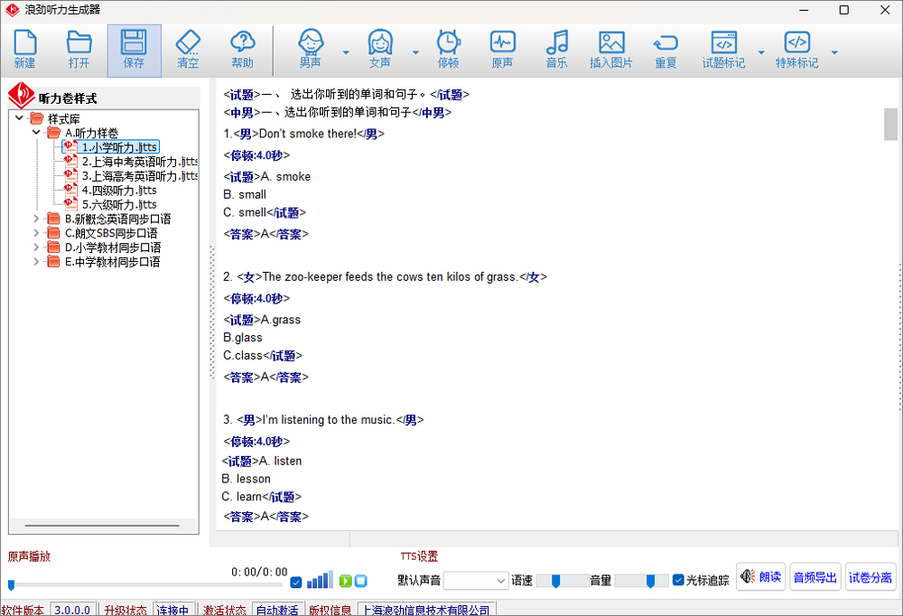 浪劲听力生成器是一款功能齐全的英语听力制作软件,是基于美国NEOSpeech语音包与TTS技术研发设计出来的。该软件主要为用户提供了中文、英语、美语的男女声听力朗读,支持调节朗读语速、停顿时间、添加英语原声、添加音乐、试题标记等内容,并支持用户编辑电脑、真人、课文等朗读内容,这样就能很好直接的帮助用户编辑英语听力朗读内容,即适合老师制作英语听力测试,也适合学生用来训练听力。