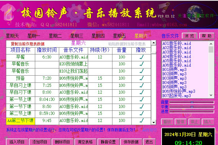 4、自动对作息时间进行备份,即使用户重装系统或换机后作息表的重新设置,校园铃声音乐播放系统也能自动帮用户恢复到以前的设置