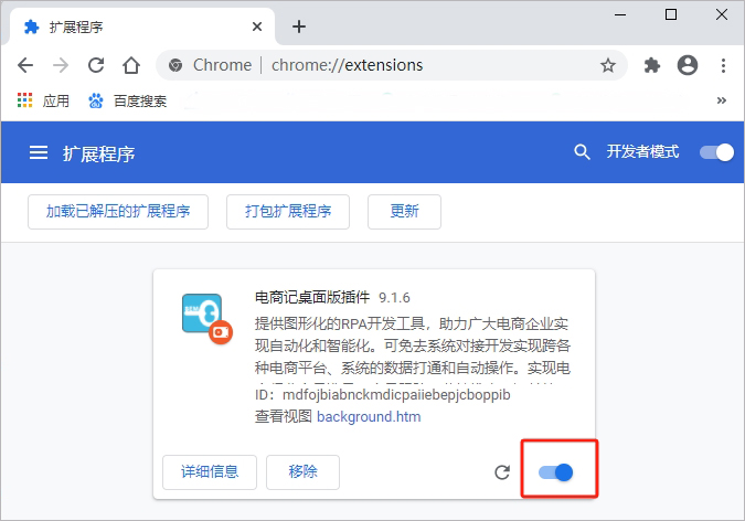 5、插件已启用。以后可在浏览器地址栏输入chrome://extensions/,禁用或启用插件。