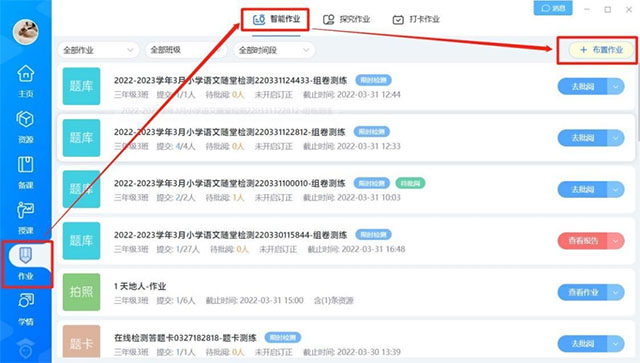 2、在左侧导航栏选择智能作业,然后点击布置作业