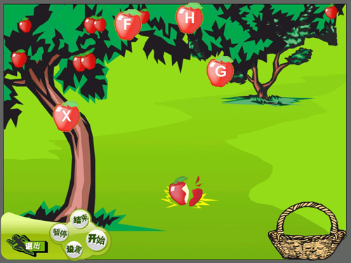 一个个诱人的苹果从苹果树上往下落,你只要能正确敲击显示在苹果上的字母,苹果就被竹篮接住,不会落在地上,那么您拯救苹果的计划就成功了。